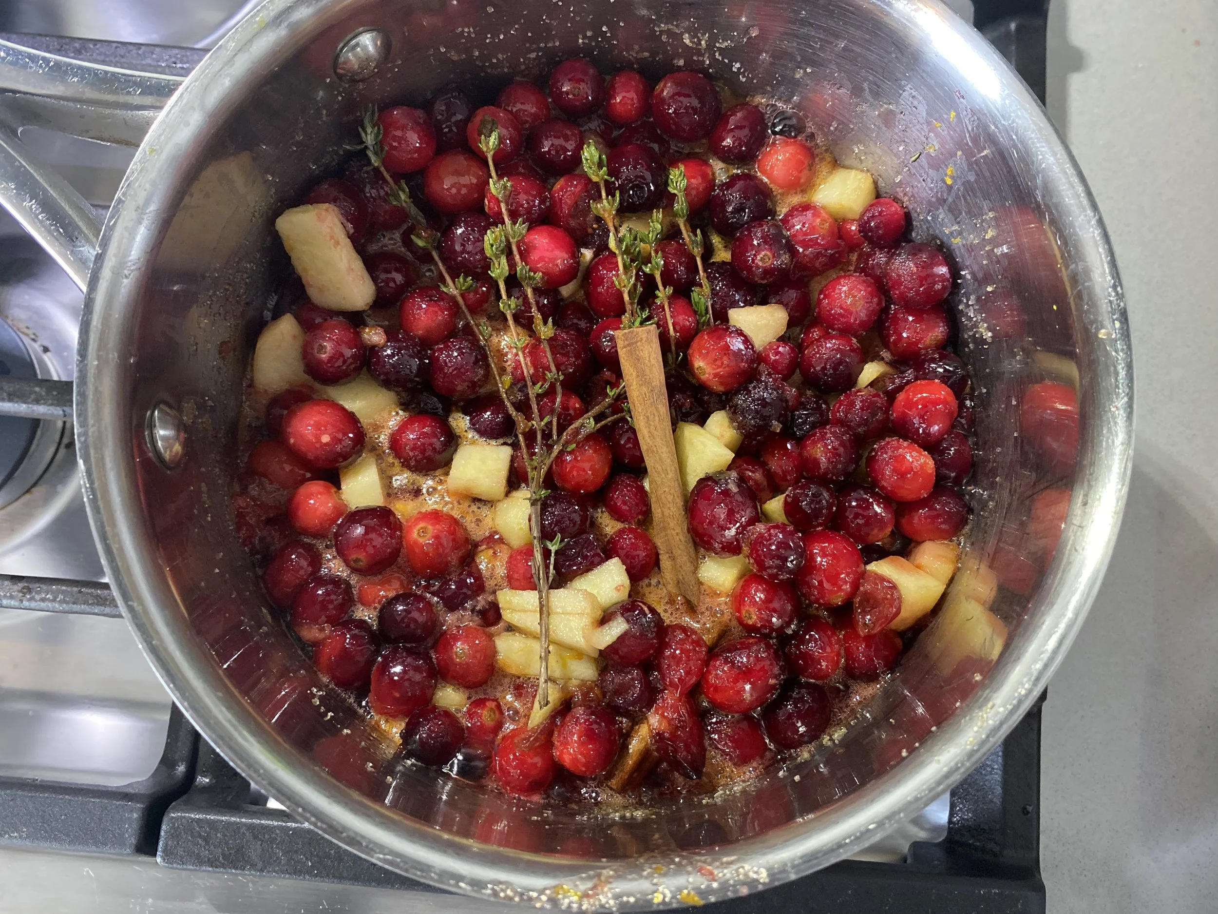 - Combine all ingredients in a medium saucepan over medium heat. Allow the mixture to come to a low boil, then reduce the heat to low. The cranberries will begin to burst. Continue cooking for 20-30 minutes until the mixture is thick and the cranberries have cooked down. The apple should be fork-tender.