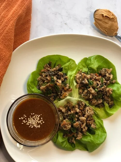 - Heat a cast-iron skillet to medium-high heat. Drizzle with olive oil. Add ground chicken and saute until cooked through and in crumbles. Add in mushrooms and saute 3-5 minutes. Mushrooms should start to brown. Add garlic, ginger, and lemongrass to the chicken mixture and saute for 1 minute. Season with salt and pepper. Stir in onions and carrots and cook for another 2-3 minutes. Onions should start to sweat and carrots should begin to lose their crunch. Stir in peanut butter until incorporated through the chicken mixture. Pour in liquid aminos and reduce heat to low. Allow mixture to simmer for 3-5 minutes while you prepare the sauce.